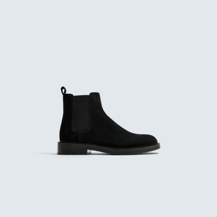 Bota estilo chelsea. Parte superior fabricada em pele com acabamento croute. Elásticos laterais para facilitar o calçar. Forma redonda. Sola