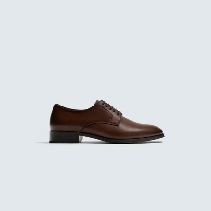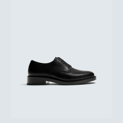 Sapato tipo derby. Parte superior lisa. Forma redonda. Sola com ligeiro salto.