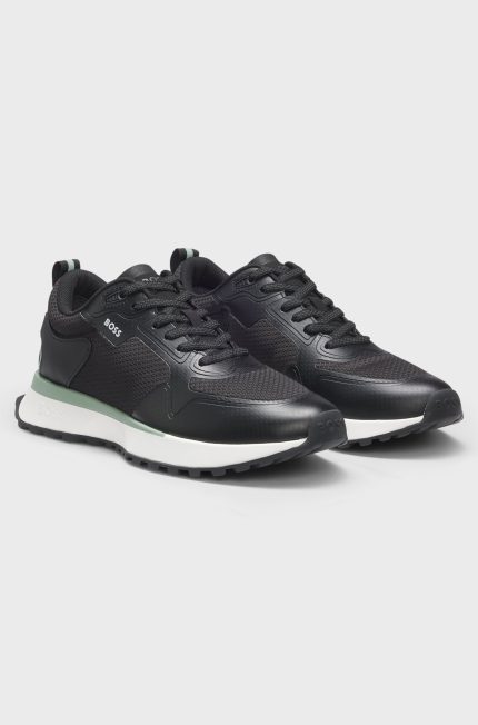 Tênis esportivos da BOSS em uma mistura de materiais, incluindo mesh, com detalhes como sola de EVA e logotipos por