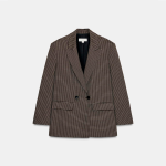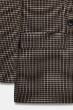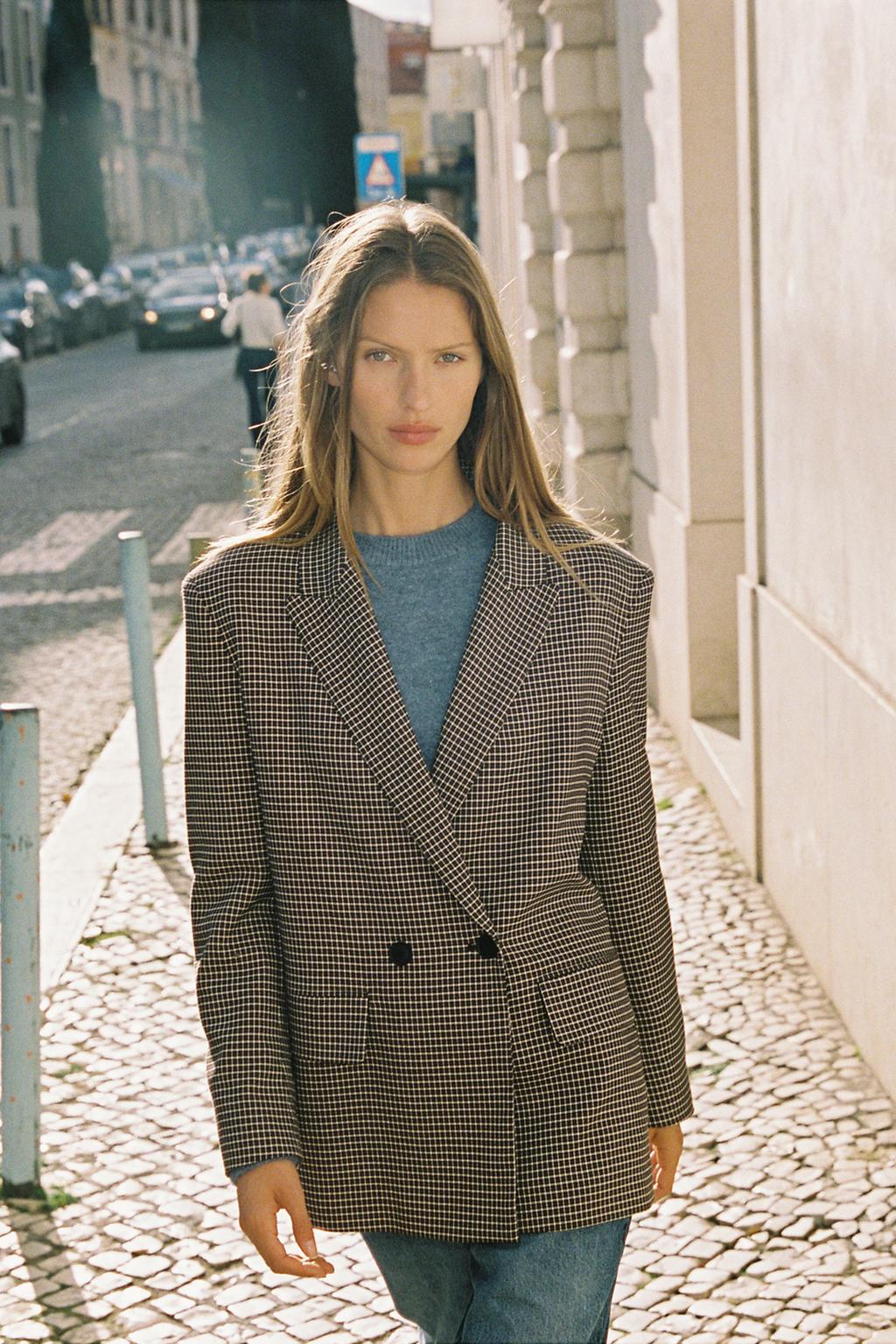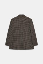 Blazer amplo com gola de lapelas e manga comprida com ombreiras. Bolsos à frente com aba. Fecho frontal cruzado com botões.