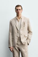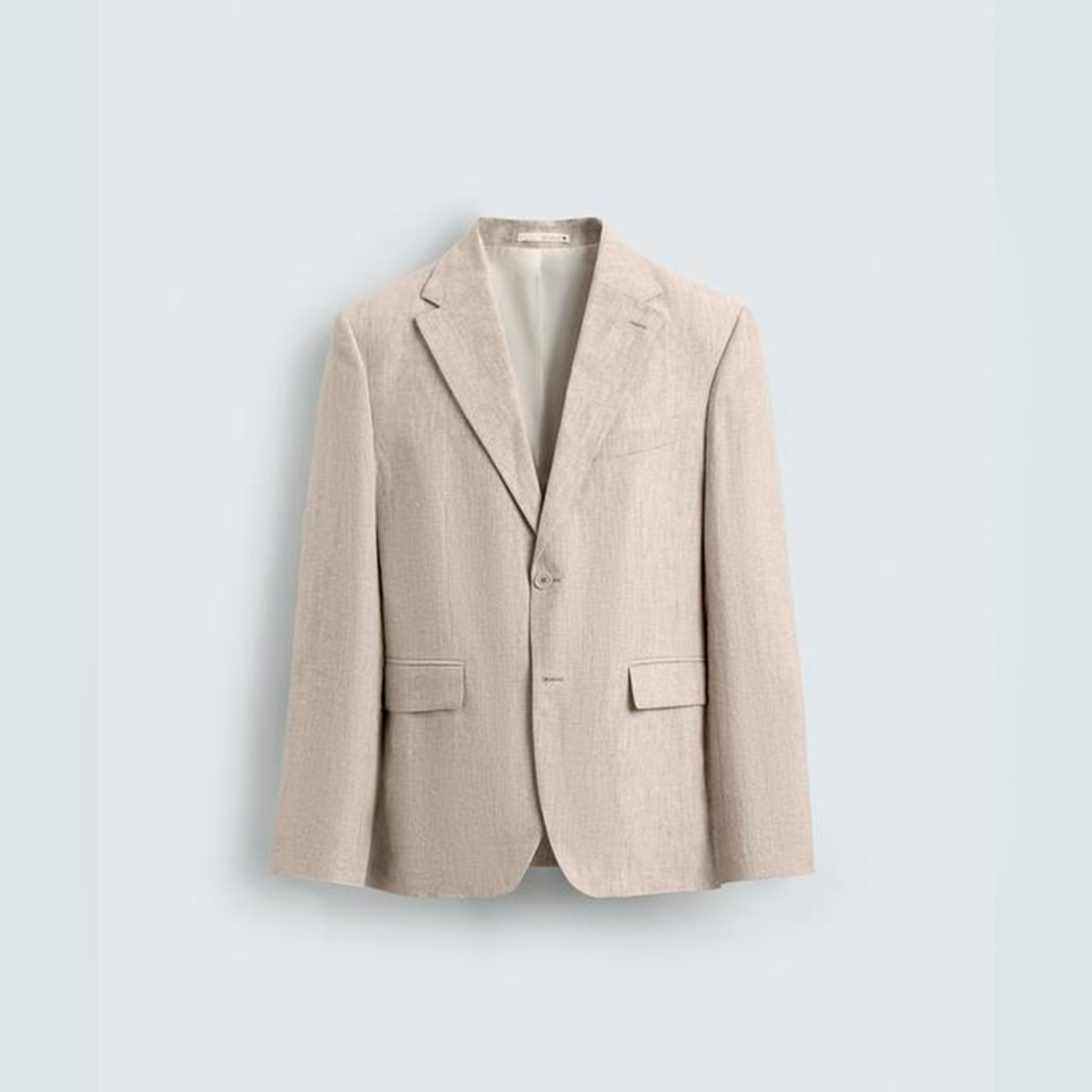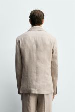 Blazer regular fit confecionado em tecido de linho. Meio forro no interior. Gola com lapelas de entalhe e manga comprida acabada em punho com botões. Bolso debruado no peito e bolsos com aba na anca. Detalhe de bolso interior. Parte inferior com aberturas nas costas. Fecho frontal com botões.