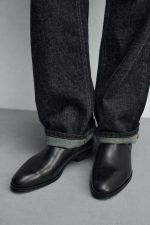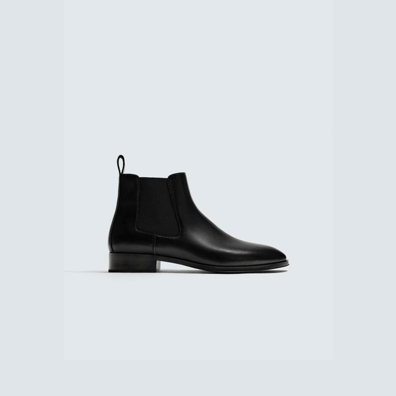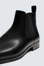 Bota estilo chelsea. Parte superior lisa. Conta com duas peças elásticas laterais e puxador traseiro para facilitar o calçar. Forma em ponta. Sola com ligeiro tacão.