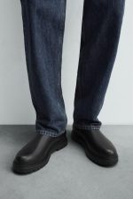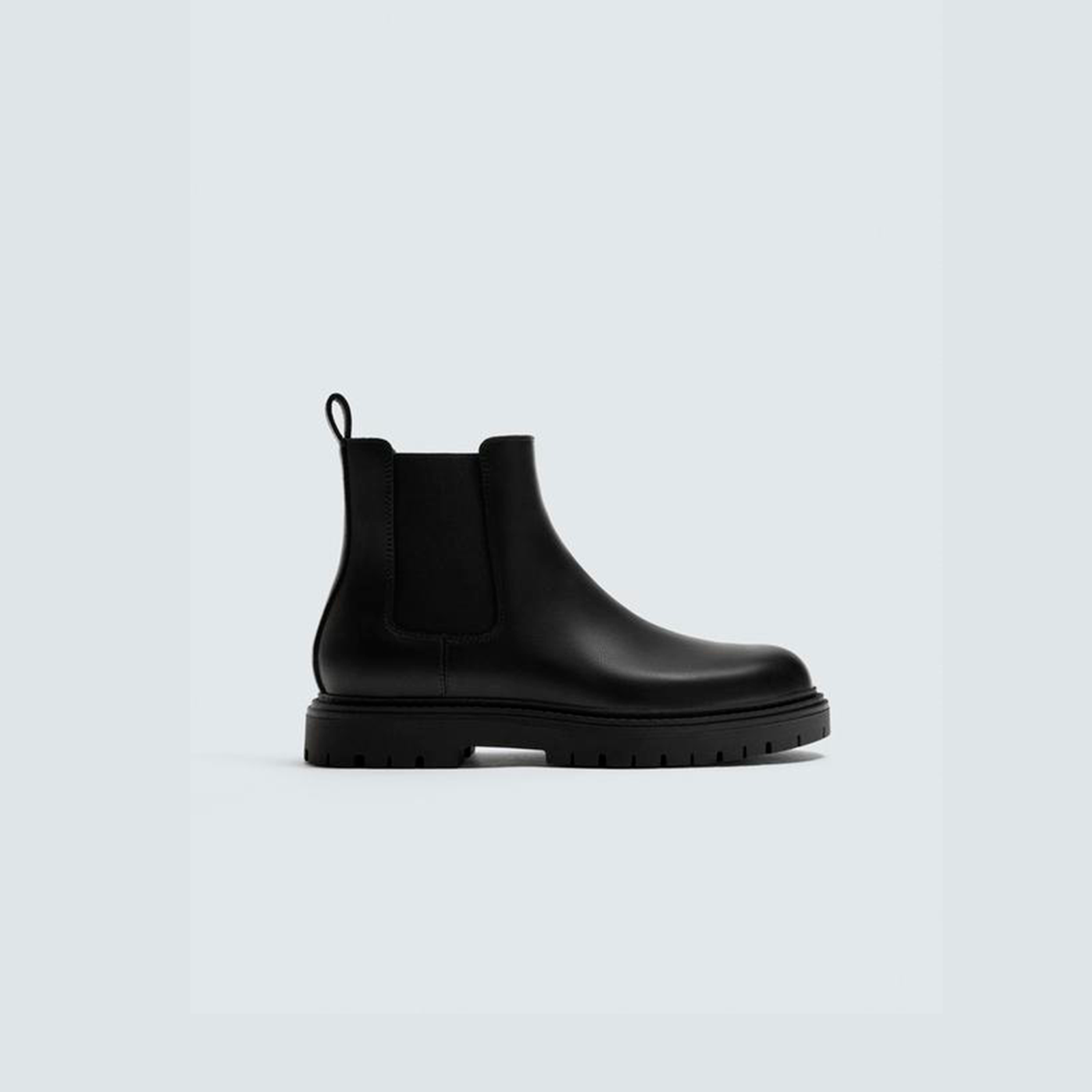 Bota tipo Chelsea. Parte superior lisa. Peças elásticas laterais e puxador traseiro para facilitar o calçar. Forma redonda. Sola com volume e sola com rasto.