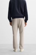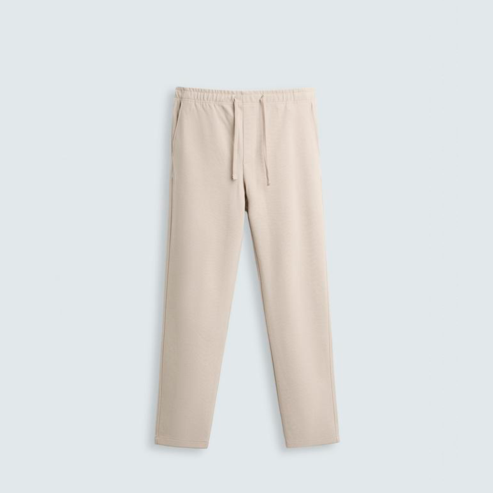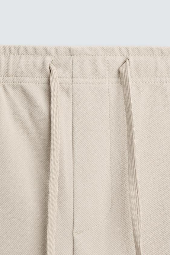 Calças confecionadas em tecido com mistura de algodão. Cintura elástica ajustável com cordão. Bolsos frontais e pormenor de bolsos com linhas vivas atrás.