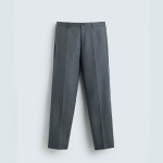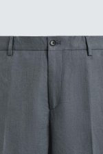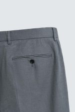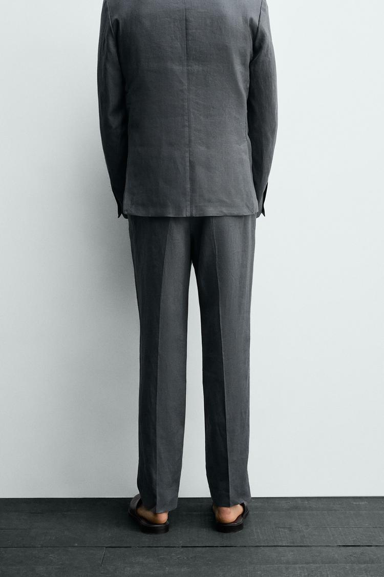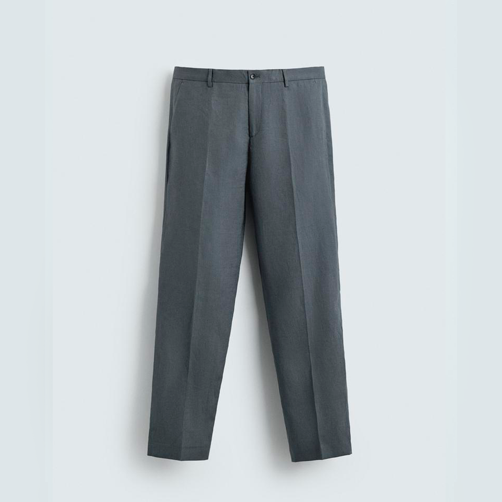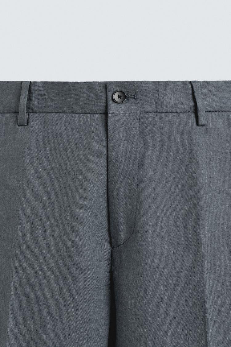 Calças regular fit confecionadas em tecido de linho. Bolsos à frente e pormenor de bolsos traseiros de vivo duplo com botão. Fecho à frente com fecho de correr e botão.