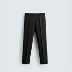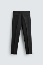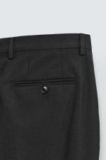 Calças regular fit confecionadas em tecido com lã. Bolsos frontais e detalhe de bolsos traseiros de fole duplo com botão. Fecho frontal com fecho de correr e botão.