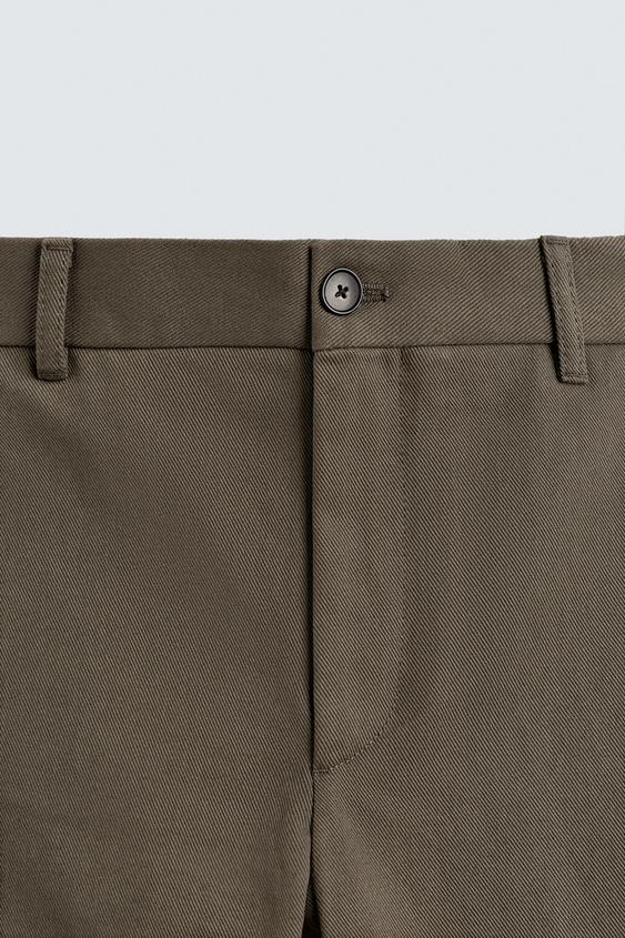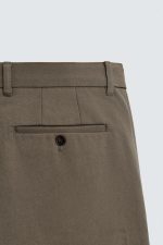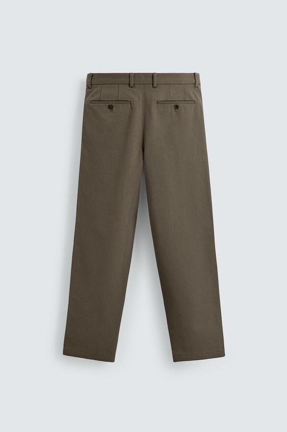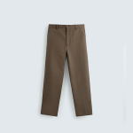Calças direitas confecionadas em tecido compacto de algodão com estrutura twill. Bolsos à frente e pormenor de bolsos traseiros com vivo e botão. Fecho de correr e botão à frente.