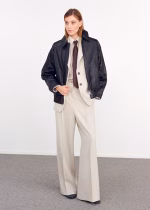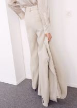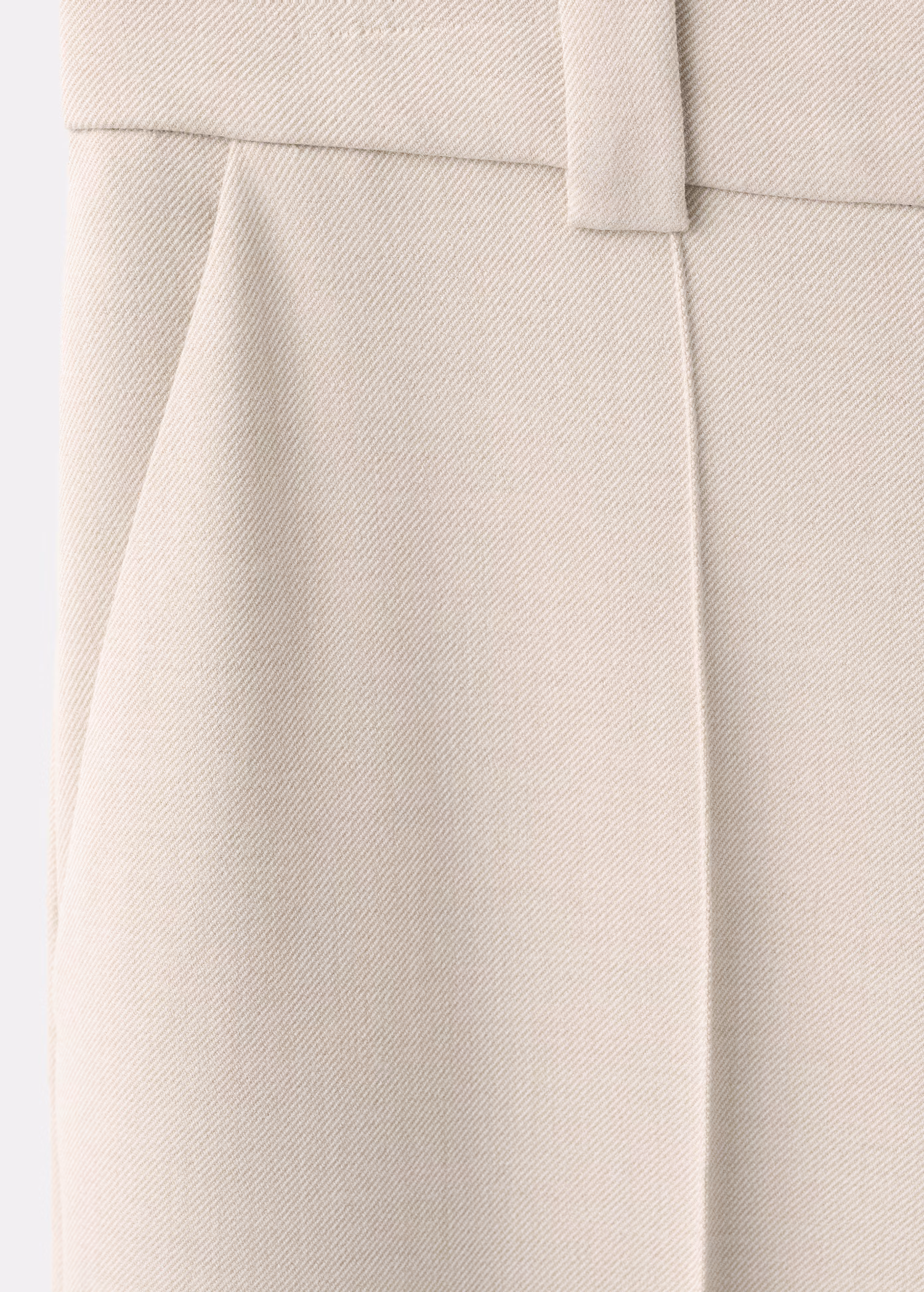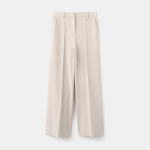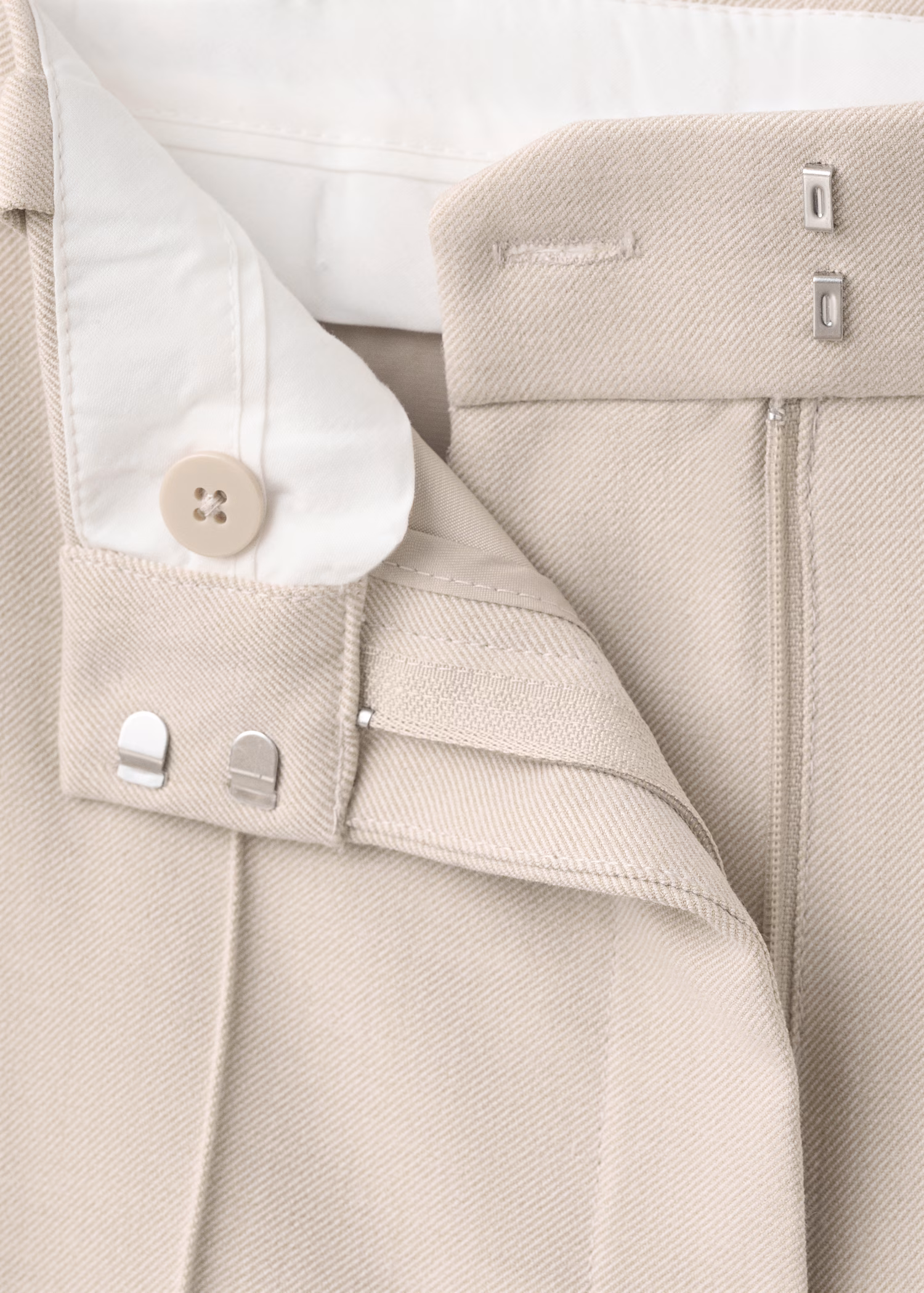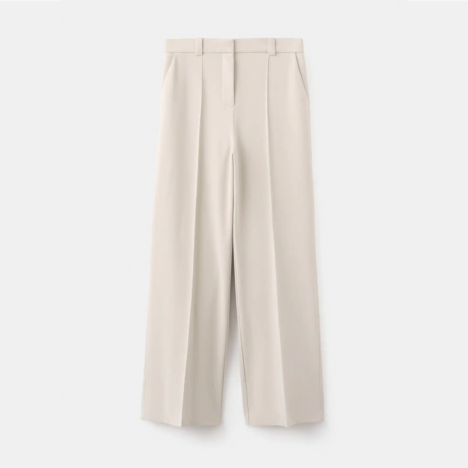 Design comprido. Design reto. Cintura média. Passantes para cinto. Dois bolsos laterais. Fecho de botão oculto, gancho e fecho de correr. Forro interior. A cor bege só está disponível ‘online’.