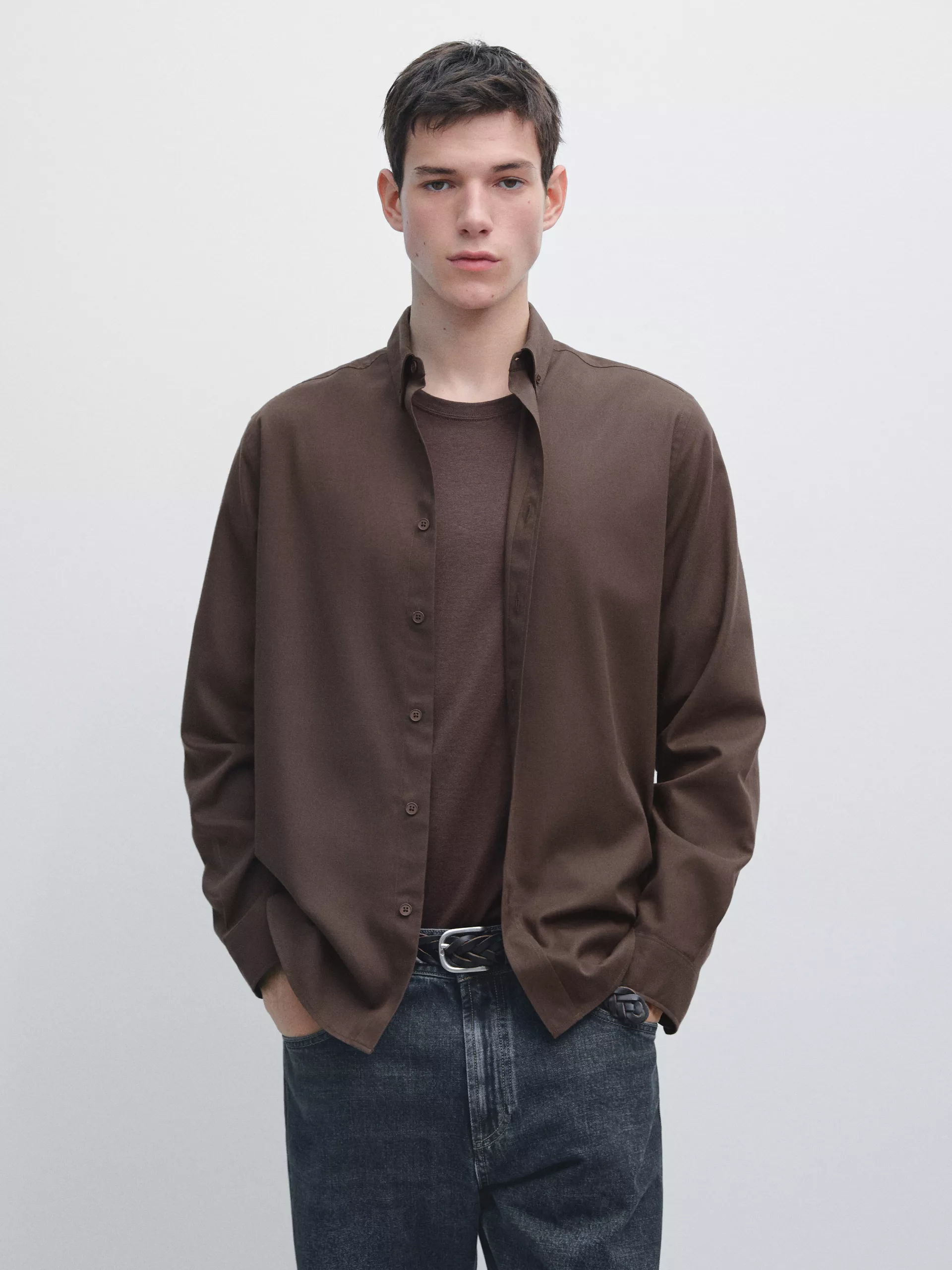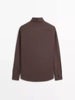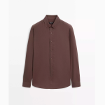 Camisa confecionada em tecido com algodão. Manga comprida com punho abotoado. Gola camiseiro. Fecho com botão de fixação à frente.