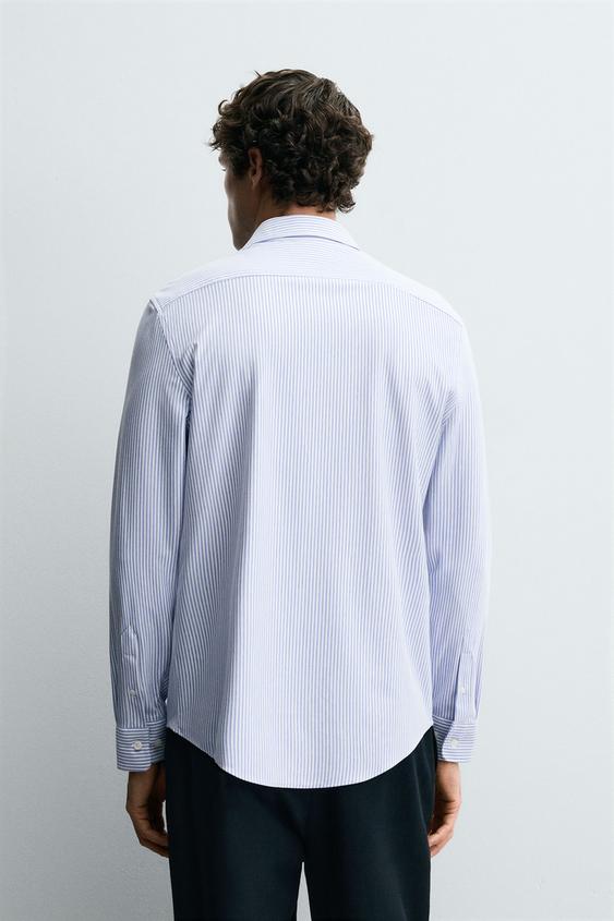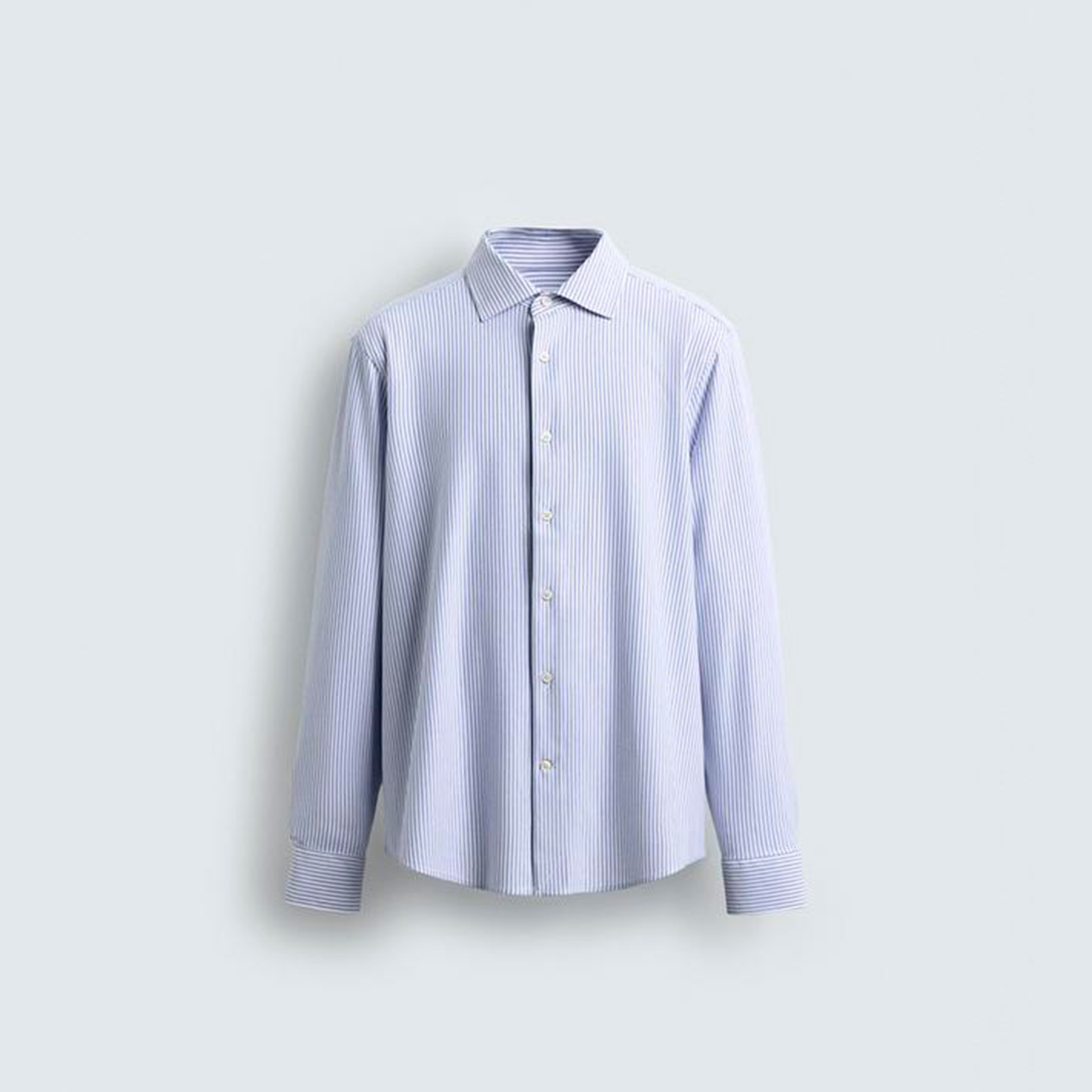Camisa regular fit confecionada num tecido que minimiza a necessidade de engomar após a lavagem. Gola italiana aberta e manga comprida acabada em punho com botão. Fecho frontal de botões.