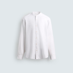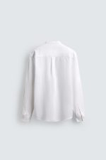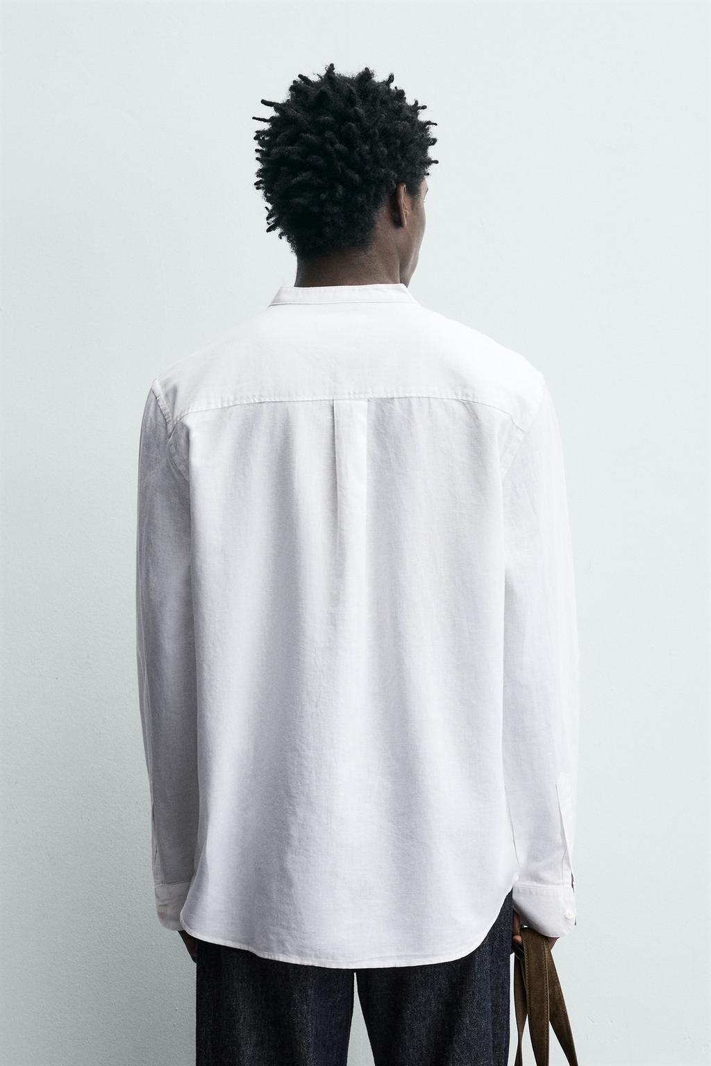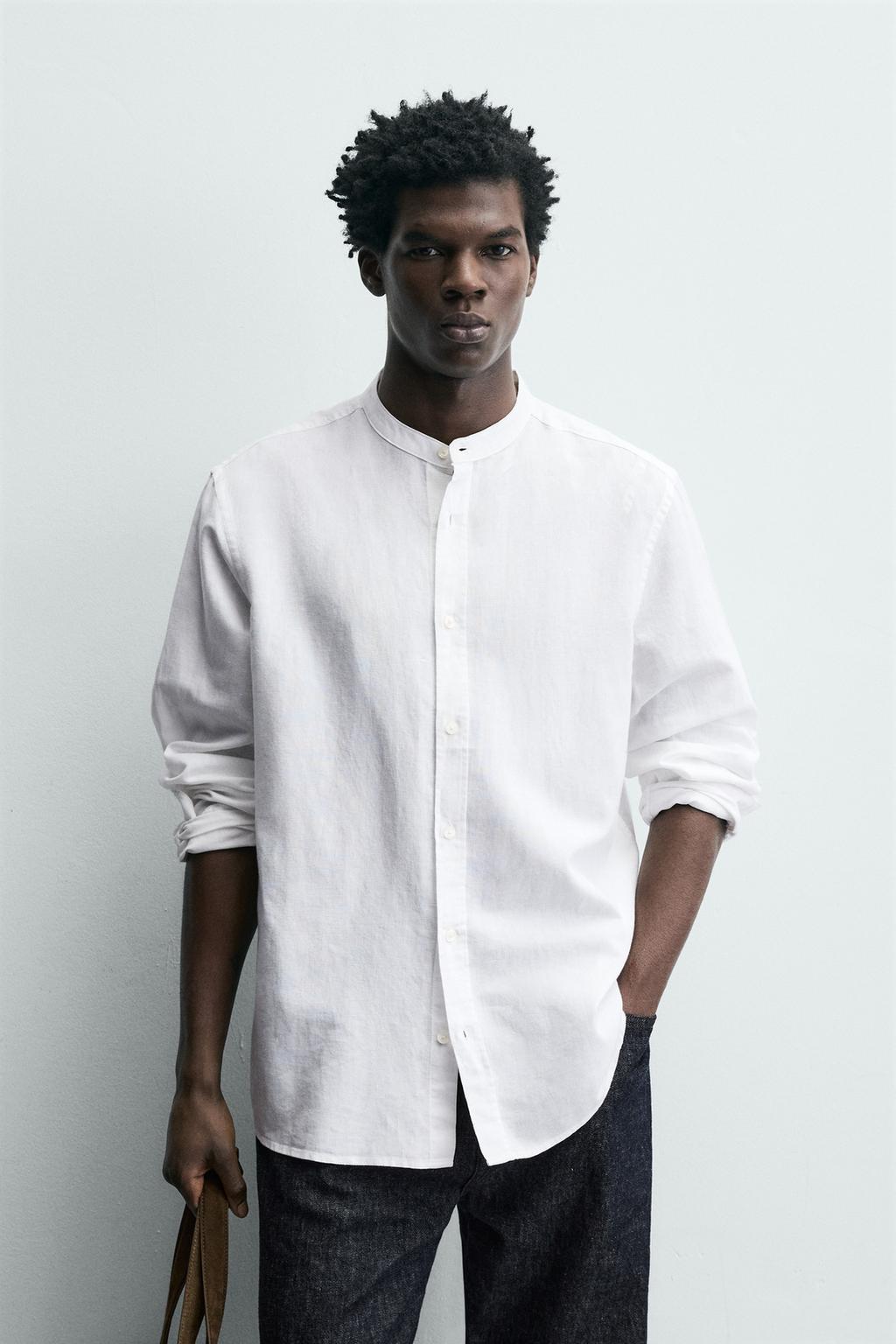 Camisa relaxed fit confecionada em tecido com linho e algodão. Colarinho com tira e manga comprida acabada em punho com botão. Fecho frontal com botões.