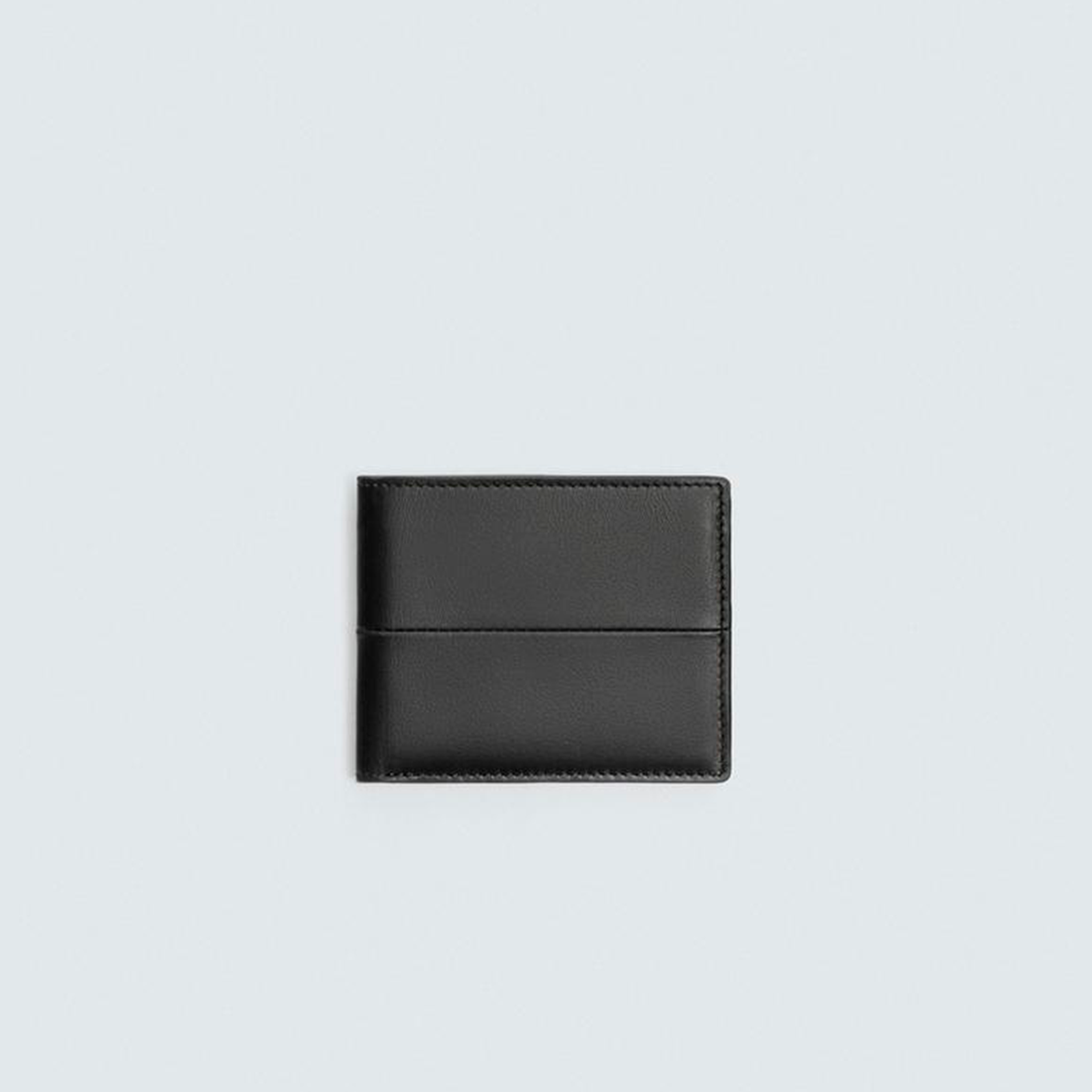 Carteira tipo carteira fabricada em pele. Detalhe de costura central. Conta com um compartimento para notas, três compartimentos para cartões, duas ranhuras laterais, um porta-moedas com fecho mediante clipe.