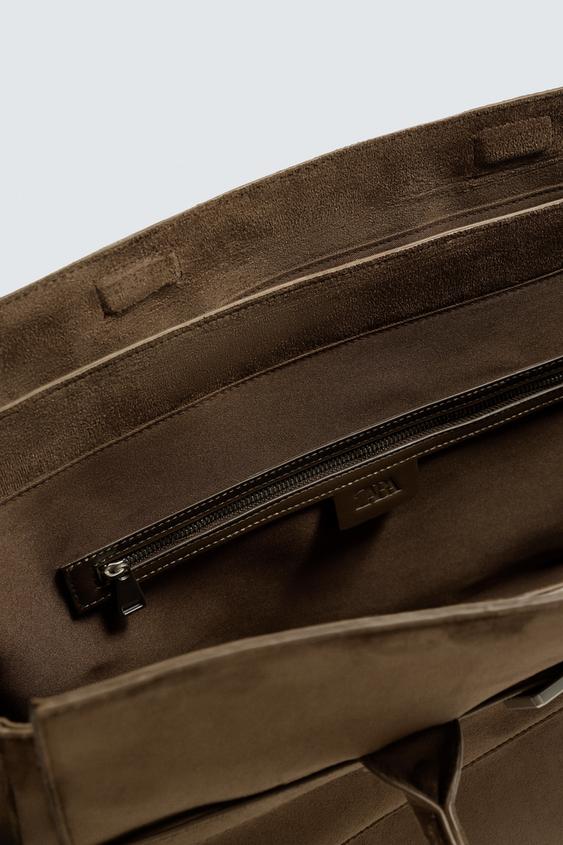 Mala de mão com detalhe de cinto. Compartimento principal com fecho de íman duplo. O interior conta com um bolso com fecho de correr. Duas alças de mão.