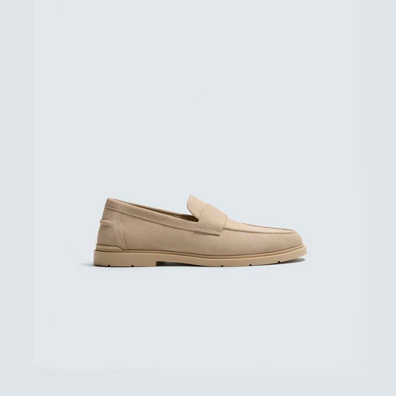 Mocassins casuais. Parte superior em pele com acabamento em croute. Detalhe de antifaz no peito do pé. Forma redonda. Sola a condizer.