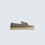 Mocassins casuais. Parte superior fabricada em pele com acabamento em croute. Detalhe de borlas no peito do pé. Sola em contraste.