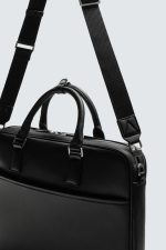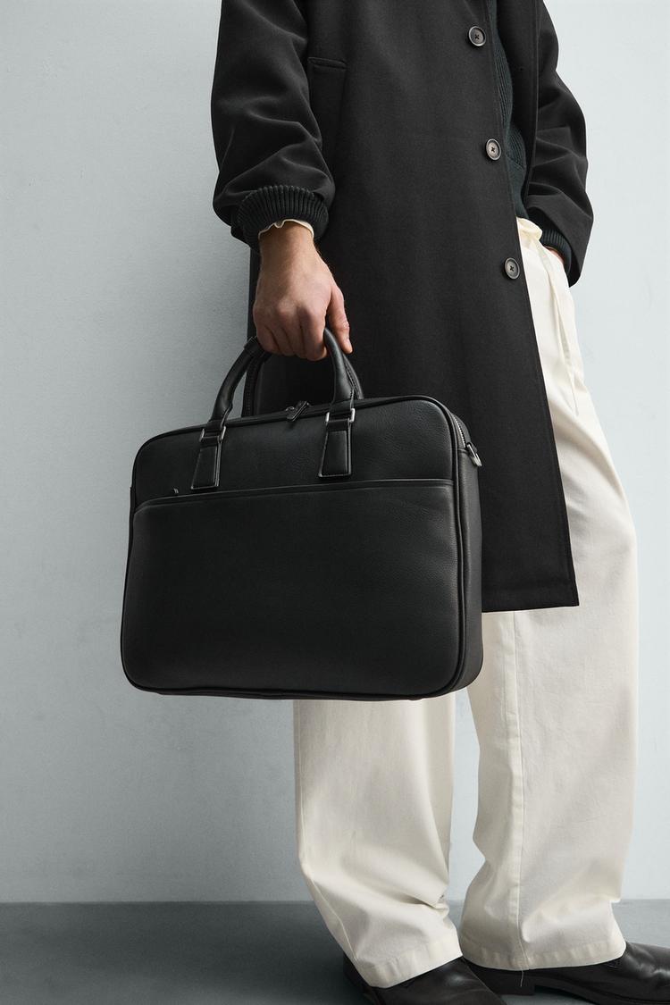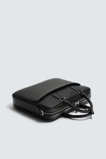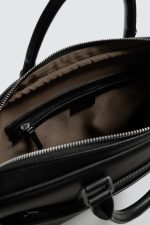 Pasta com acabamento gravado. Compartimento principal com fecho de correr. O interior possui um bolso para dispositivos eletrónicos e portáteis de até 13 polegadas. A parte frontal tem um bolso plano. Duas alças de mão e uma alça de ombro ajustável e removível.