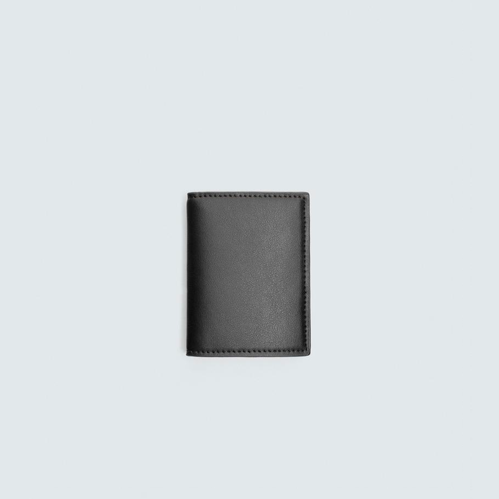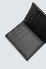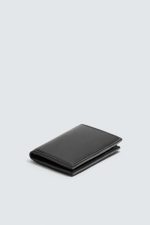 Carteira vertical. Compartimento principal com bolso para notas. Dispõe de três posições para cartões, duas em cada lado. Detalhe de pespontos a combinar.