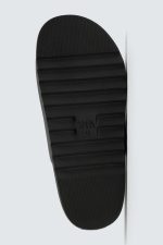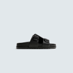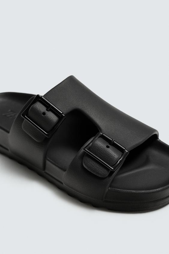 Sandália com acabamento de efeito de caucho com duas tiras largas no peito do pé com fecho de fivela. Palmilha com formato anatómico. Sola a condizer.