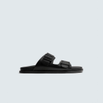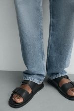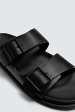 Sandália com duas tiras largas na gáspea com fecho de fivela. Palmilha com forma anatómica. Sola rasa em tom.