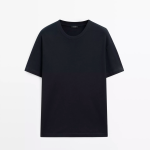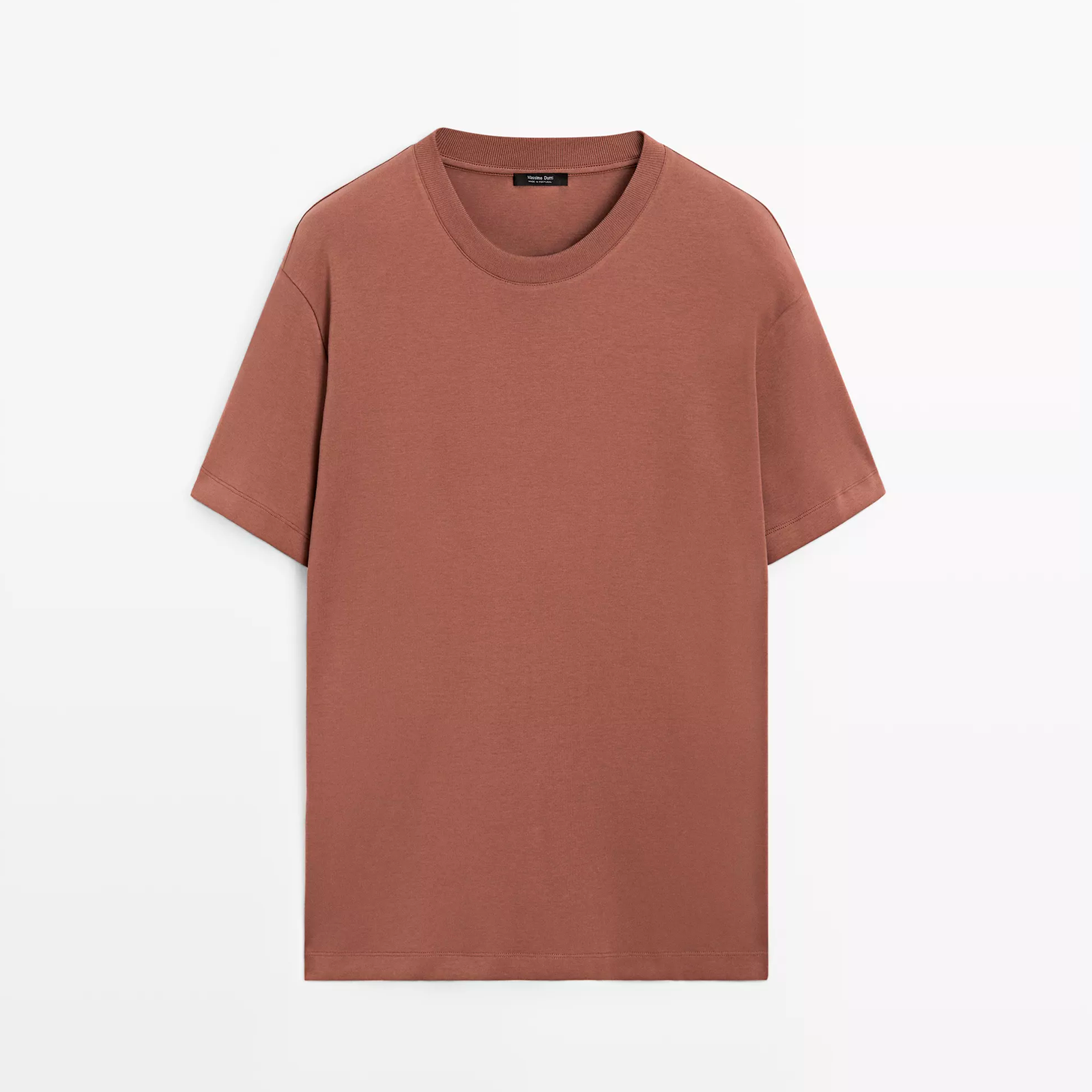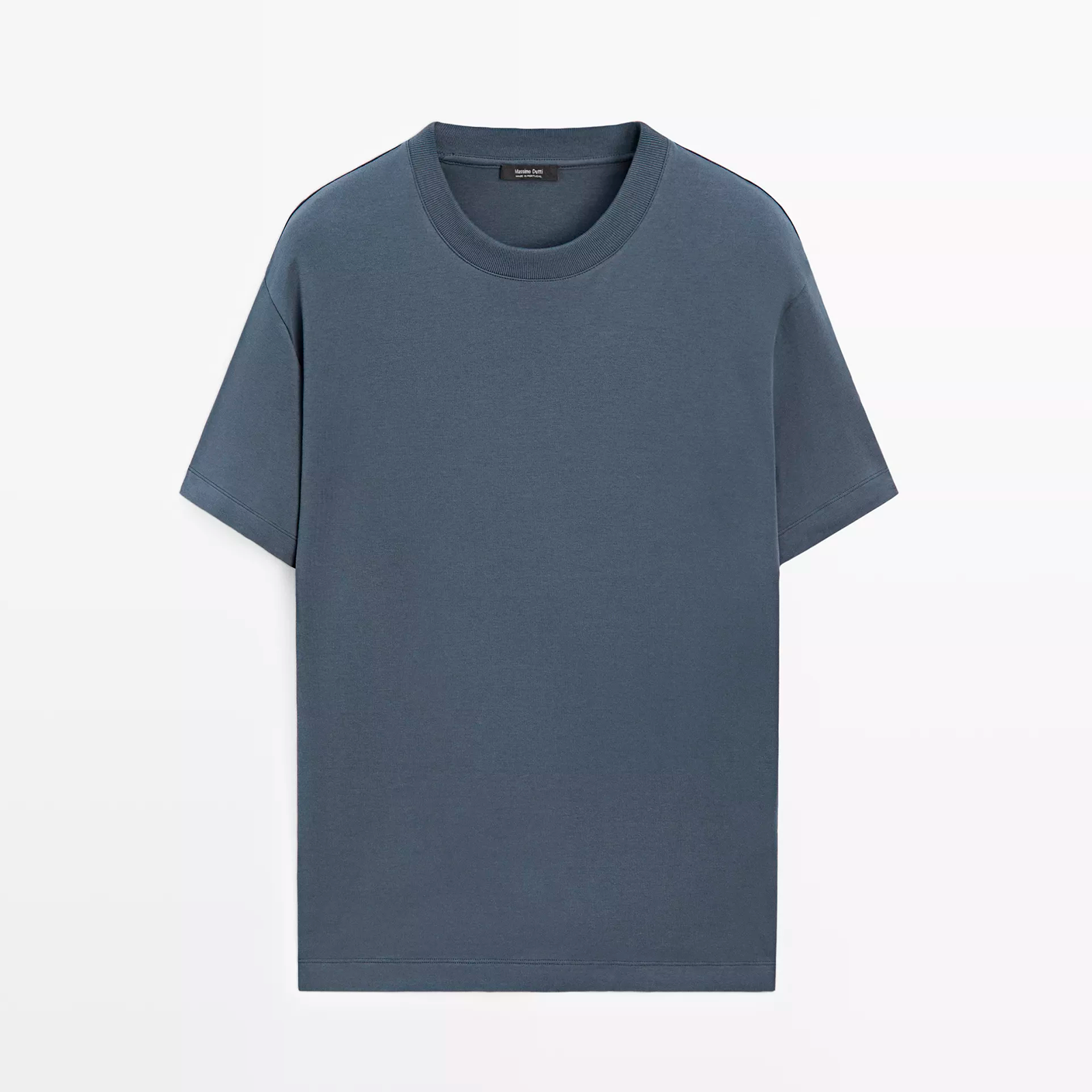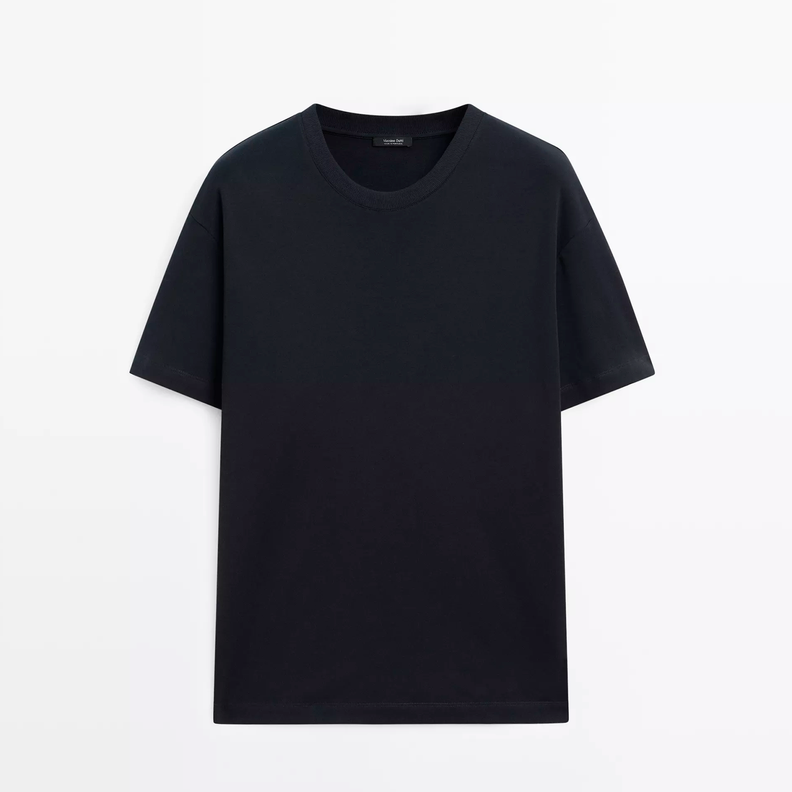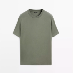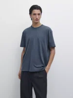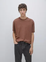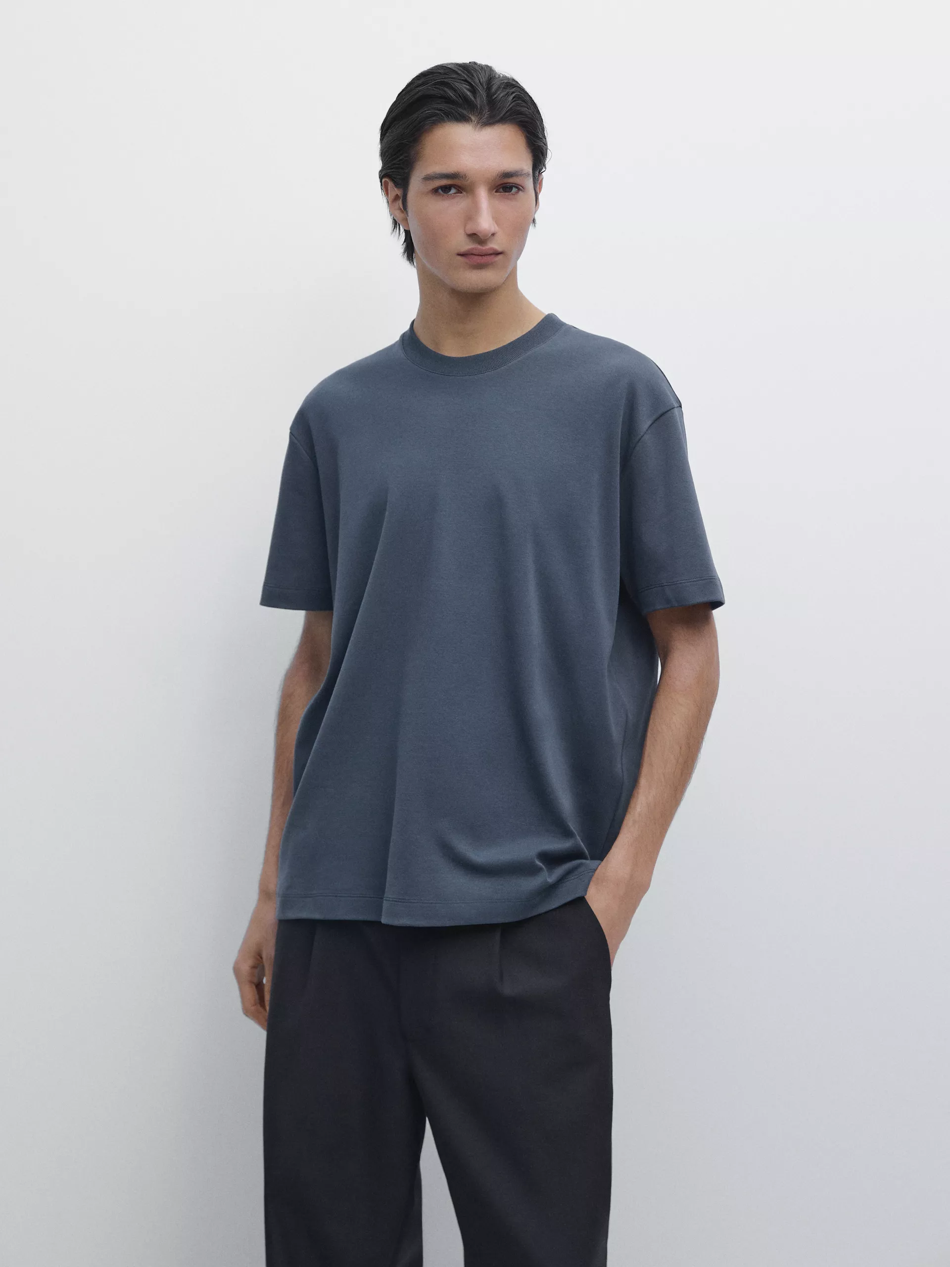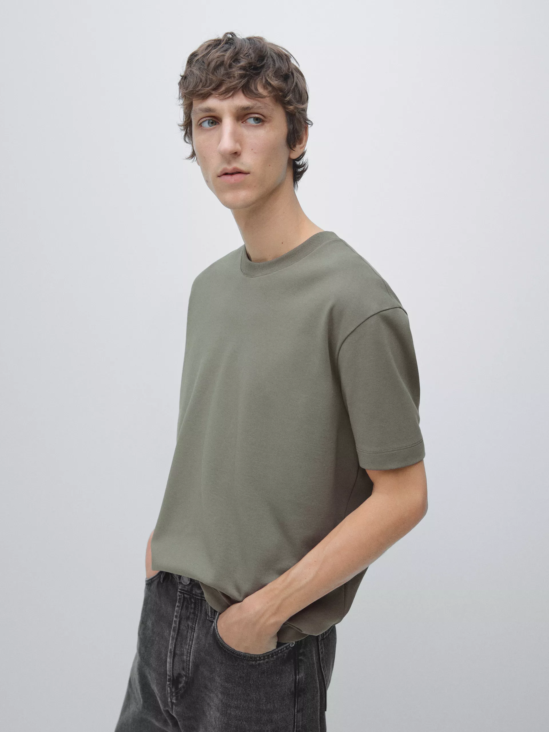 T-shirt confecionada em tecido algodão. Decote redondo. Manga curta. Silhueta ampla e descontraída, sem ajuste ao corpo.