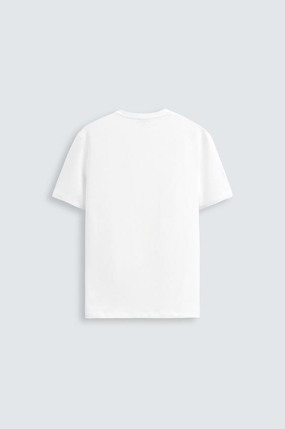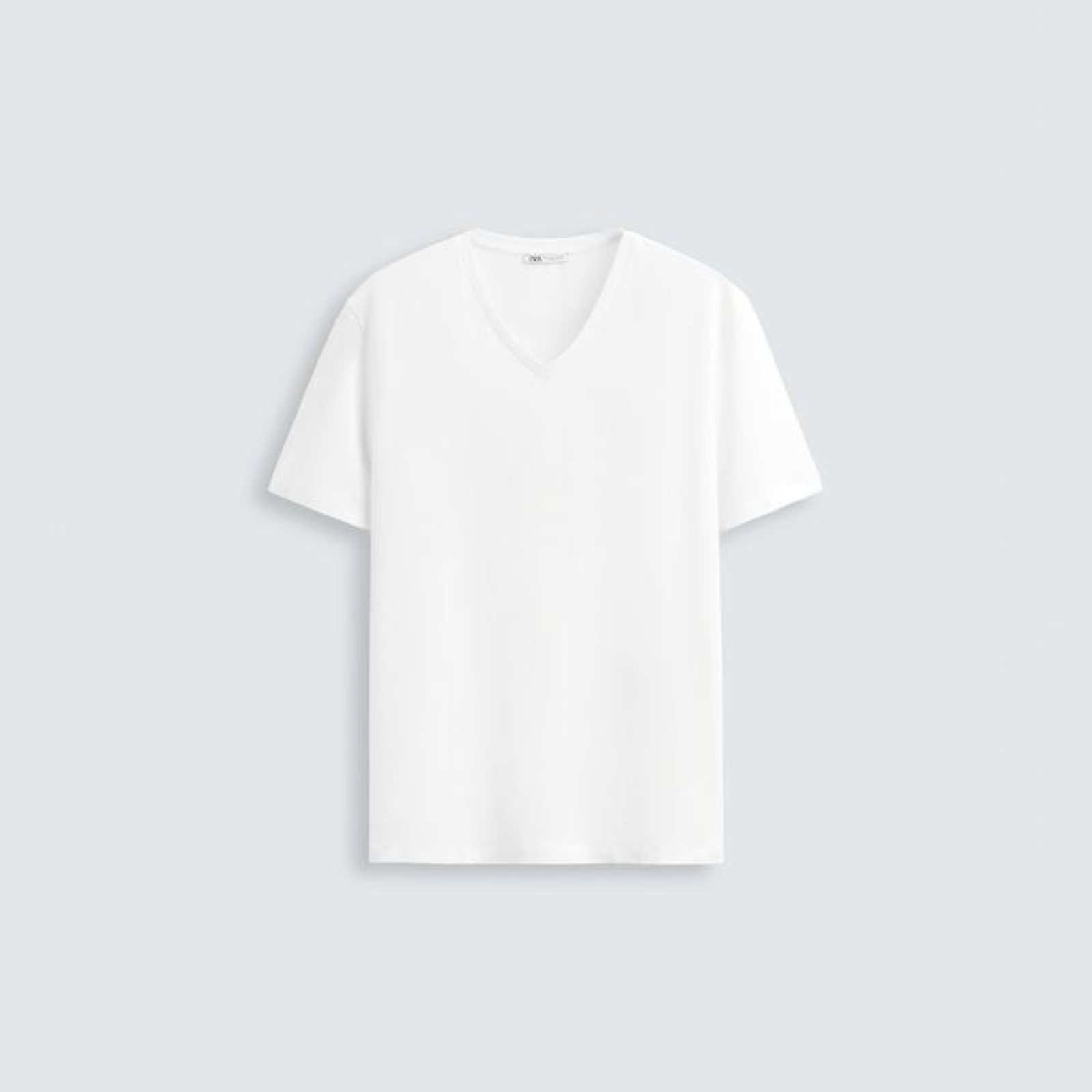 T-shirt slim fit confecionada em algodão com elasticidade. Decote em bico e manga curta.