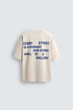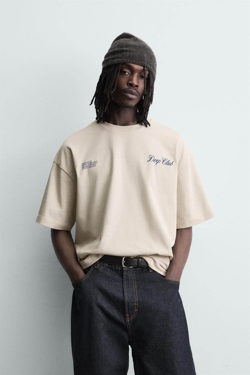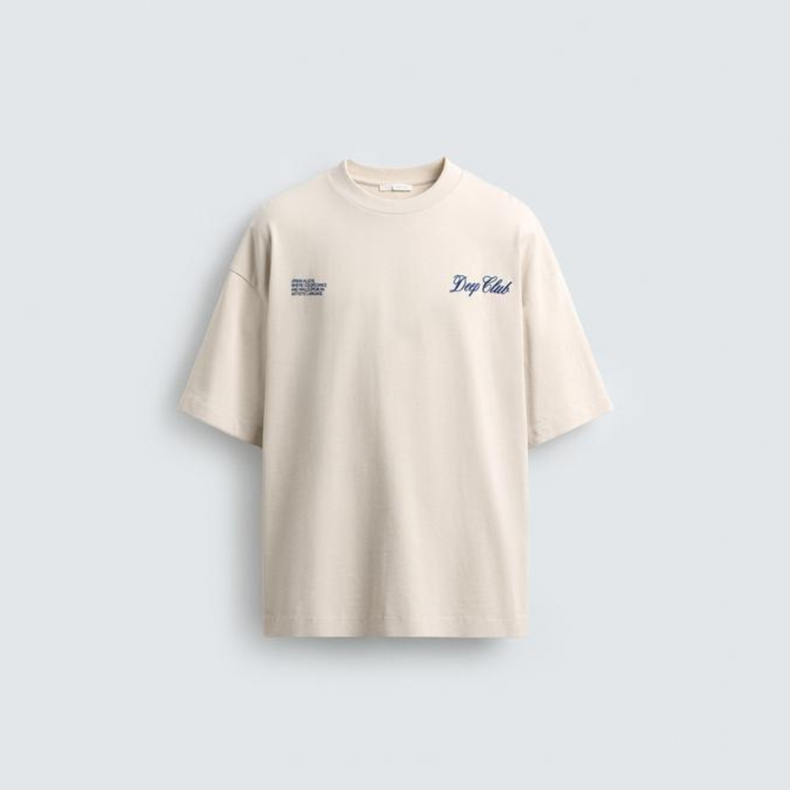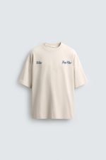 T-shirt relaxed fit. Decote redondo e manga curta. Estampados combinados em contraste na frente e nas costas.