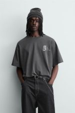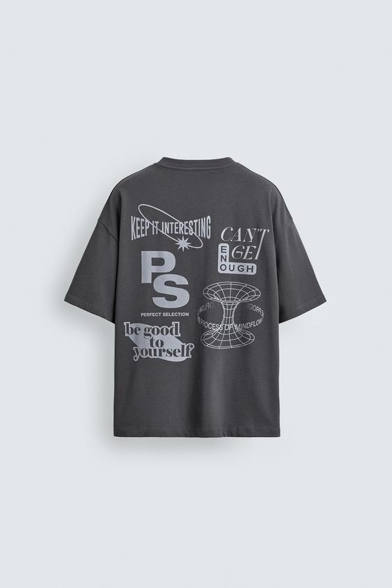 T-shirt relaxed fit. Decote redondo e manga curta. Estampados combinados em contraste na frente e nas costas.